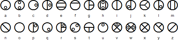 hodge podge of codes. A little web research reveals that the first is Matoran from the BIONICLE lego set, the second is Gold Bug, and the third is yet another variation on Pigpen.
