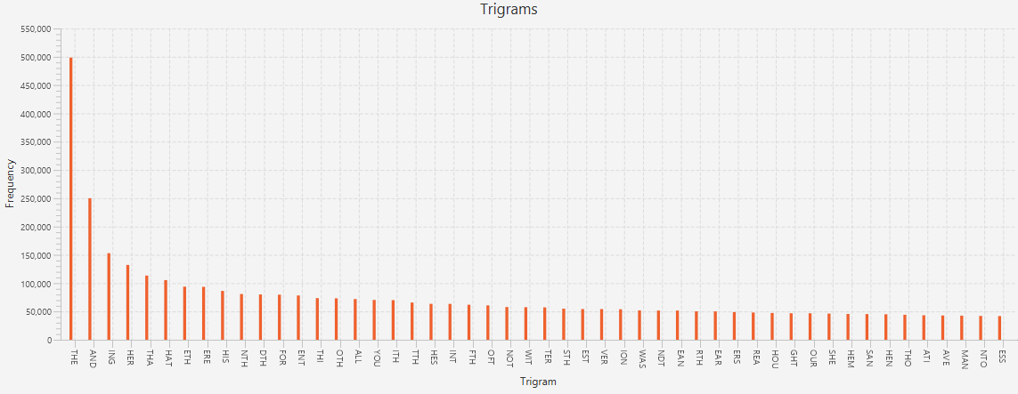 A common attack on RKC is cribbing. Given the knowledge that both the plaintext and key are, for example, English; it should be possible to choose a word or phrase that one believes is likely to appear in the plaintext (or key) and iterate over the ciphertext looking for decryptions that appear to also be English. When a promising decryption is found, the crib and its decryption are accepted as candidates for the plaintext and key. Additionally, in the likely event that word boundaries do not line up in the plaintext and key, it may be possible to derive additional characters by completing partially decoded words or phrases (e.g. “migh” will likely be followed by “t” possibly “ty”; “once upon a” could be followed by “time”). By repeating this process, it may be possible to discover large portions of the plaintext and key. Combining results across many cribs, one will eventually derive the plaintext.To my dismay, this approach resulted in only small disconnected words and bits that appeared to be – but weren’t quite – English. This process was slow and I didn’t have any way to automate it.