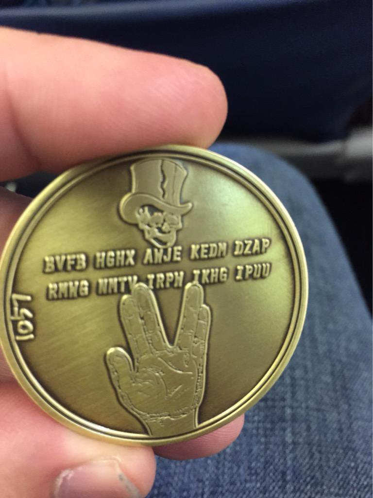 Fast forward three years. Defcon 23 has concluded and the hackers have begun their journeys back home. MLF did not win the badge challenge, but I’m still feeling the itch. As I line up to board my flight back to the East coast, I notice that 1o57 is on my plane and I remember the cipher etched in this year’s Uber Badge coin. As the plane climbs to 10,000 ft, I crack open my laptop and transcribe the cipher text into my program’s input. Seconds later, I have a 90% solution – plenty enough to recover the original key from an online search. I write the solution on a scrap of paper and hand it to 1o57 as I deplane.